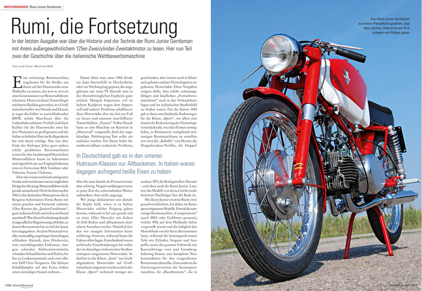 Die legendären “Cafe Racer” sind beim Ace Cafe in London entstanden. Die Geschichte aus den 1960er Jahren ist bekannt: In der Music Box wurde eine Single abgespielt und vor dem Ende musste man es mit dem Motorrad rund um die Häuserblöcke rechtzeitig zurück zum Ace Cafe schaffen. Und die müssen einfach britisch sein. Sieben Stück davon stellen wir in der Ausgabe 2/2016 vor, alle mit stark englischem Akzent. Und noch eine Engländerin, die Triumph T 120C TT Special, die extra für die amerikanischen Wüstenrennen angeboten wurde. Außerdem widmen wir uns Gaston Rahiers Dakar-BMW, Angel Nietos Morbidelli 350, dem unkonventionellen Puch-Motorroller RL 125 und noch einmal der wundervollen Rumi Junior Gentleman.