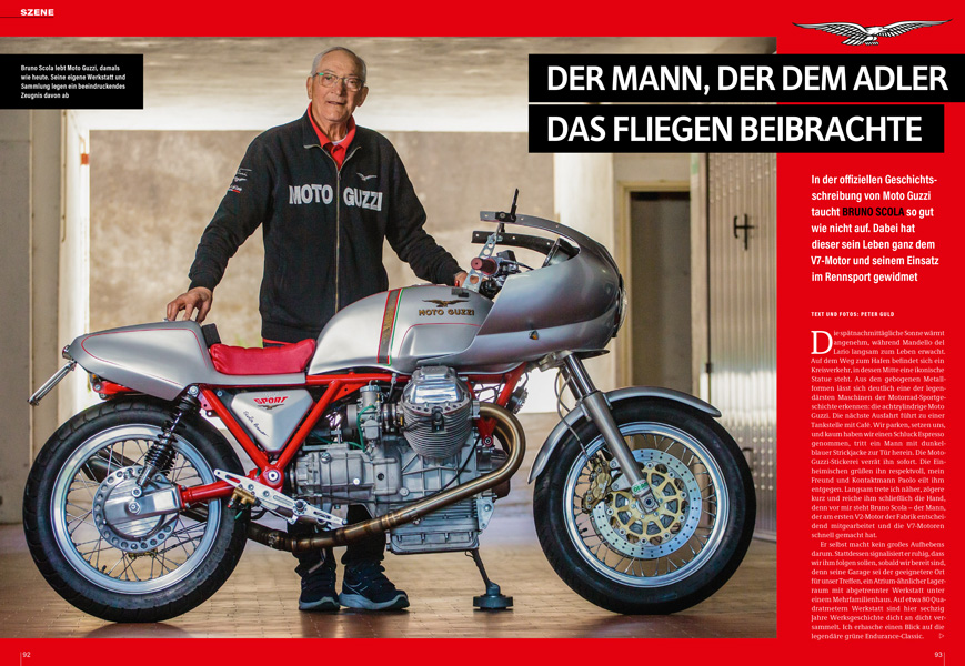 - Bei „Mister Guzzi“ Bruno Scola: Bruno Scola lebt Moto Guzzi, damals wie heute. Seine eigene Werkstatt und Sammlung in Mandello legen ein beeindruckendes Zeugnis davon ab