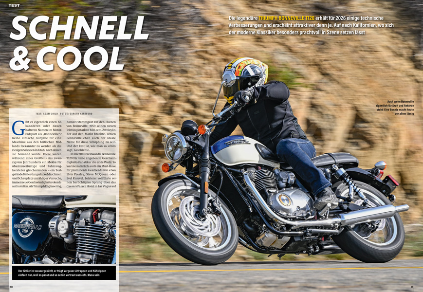 - Triumph Bonneville T120: Das Urgestein der Triumph-Reihe erhält für 2026 technische Verbesserungen