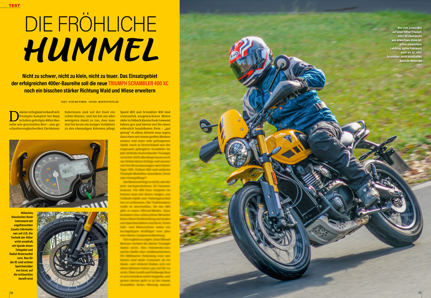 - Triumph Scrambler 400 XC: Die 400er-Baureihe soll die durch die neue XC ein bisschen stärker Richtung Wald und Wiese erweitert werden