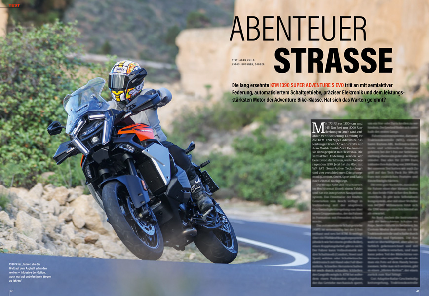- KTM 1390 Super Adventure S Evo Lang ersehnt: mit semiaktiver Federung, automatisiertem Schaltgetriebe und dem leistungsstärksten Motor der Adventure Bike-Klasse