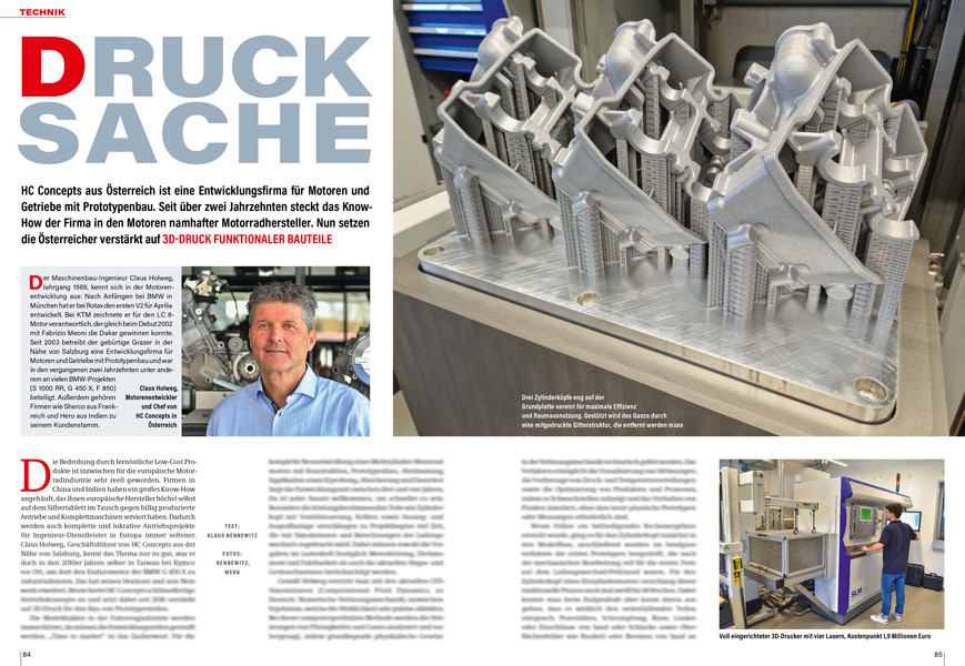 Im Bereich der Entwicklung wurde die österreichische Firma HC Concepts besucht, die Versuchsmotoren aus dem 3D-Drucker herstellt. Eine spannende Reportage über die moderne Fabrikationstechnik.
